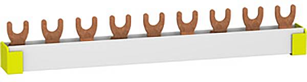 Phasenschiene Gabel Resi9. 3-polig, 9 TE, ablängbar, Nennstrom 63A, Betriebsspannung (Ue) 230/400V AC, Isolationsspannung 500V. Farbe Weiß RAL 9003. Endkappen gelb.