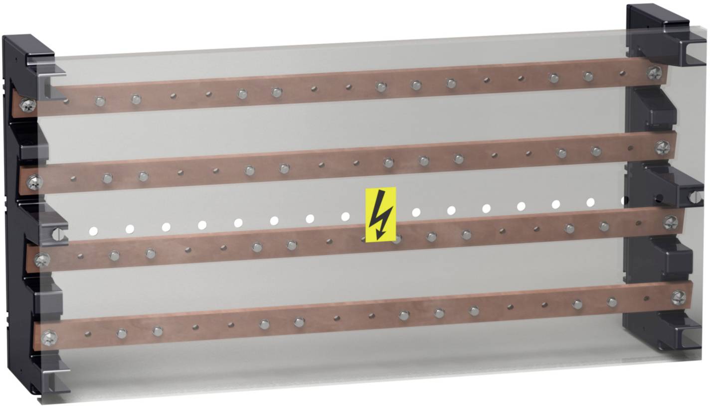 PrismaSeT P. Linergy BS Etagenklemmenblock 4-polig mit einem Sammelschienenquerschnitt von 32 x 5 mm und einer zulässigen Stromstärke bis 400 A, mit Bohrungen in 25 mm Abständen, mit 4 Einspeisungen pro Phase mit Durchmesser 12.2 mm Bohrungen. und abgangsseitiger Anschlusskapazität von 13 x 16 bis 50 mm² pro Phase, mit einer Bemessungsstoßstromfestigkeit (Ipk) 55 kA, Bemessungskurzzeitstrom (Icc) 150 kA, Bemessungsisolationsspannung (Ui) 750 V AC. Bemessungsspannung (Ue) 440 V AC, Bemessungsstoßspannungsfestigkeit (Uimp) 8 kV, zur Montage auf einer Montageplatte mit einer Breite von 470 mm, einer Höhe von 235 mm und einer Tiefe von 115 mm. 2 Stück mehrstufige Träger aus Isoliermaterial, 4 Stück abgeschrägte Kupferschienen mit Bohrungen, 36 Stück Schrauben M6 x 16 mm mit Beilagscheiben und 1 Stück frontseitige Berührungsschutzabdeckung im Lieferumfang enthalten.