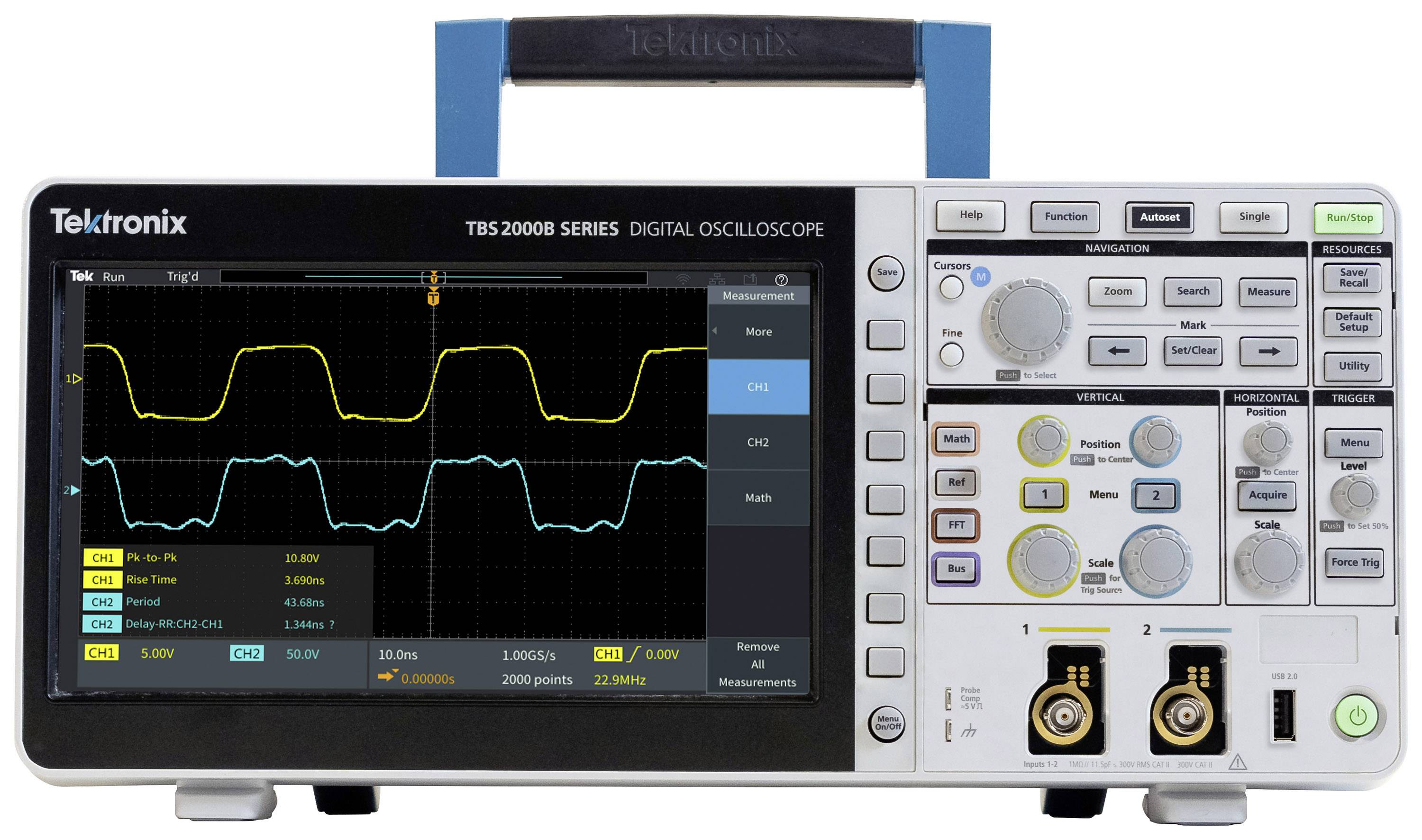 Die Oszilloskope der Serie TBS2000B mit einem 9-Zoll-WVGA-Display, einer Aufzeichnungslänge von 5 Millionen Punkten und einer Abtastrate von 2 GS/s erfassen und zeigen deutlich mehr Signale an, um Sie beim Debuggen und Validieren der Designs zu unterstützen. Analysieren Sie Ihre Signale einfach und sicher mit den neuen On-Waveform-Cursoranzeigen und 32 automatischen Messungen, die jeweils mit informativen Tipps versehen sind. Die TekVPI®-Tastkopf-Schnittstelle unterstützt traditionelle passive BNC-Tastköpfe, ermöglicht aber auch eine breite Anwendungsabdeckung mit den neuesten aktiven Spannungs- und Stromtastköpfen.