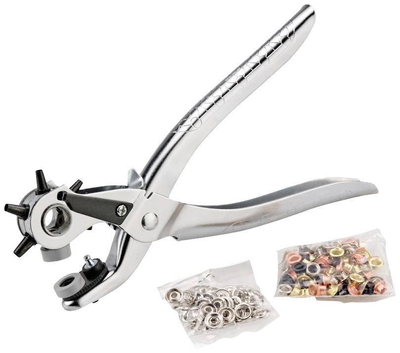 Revolverloch-, Ösen- und Druckknopfzange in einem, inkl. 100 Ösen Ø 4 mm und 48 Druckknöpfen, zum Stanzen von Löchern in Leder, Textil- und Kunststoffmaterial, mit fünf auswechselbaren Lochpfeifen und einer Druckknopfstanze.