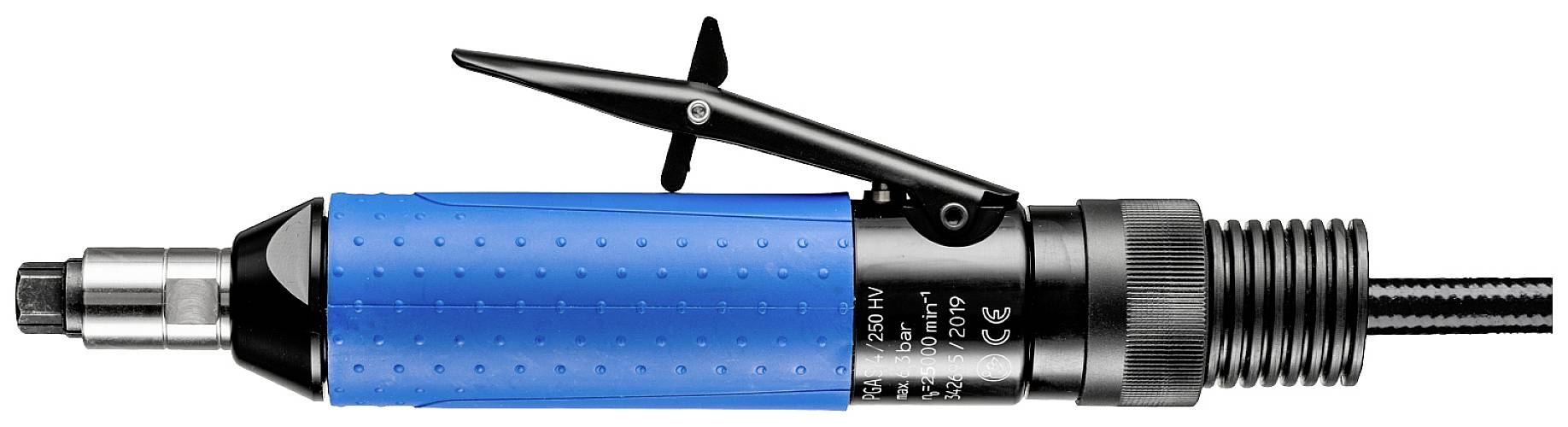 L'entraînement est équipé d'un logement pour pince de serrage pour outils à tige. Le tuyau d'échappement de l'entraînement à air comprimé se trouve à l'arrière. Grâce à la vanne à levier, l'entraînement dispose d'un circuit homme mort. Tuyau d'air d'alimentation 1 m AB et 2,5 m avec raccord fileté 1/4" extérieur et passe-câble fileté (STGI), pince de serrage 6 mm, 2 clés de serrage. Entraînement puissant dans un format compact.