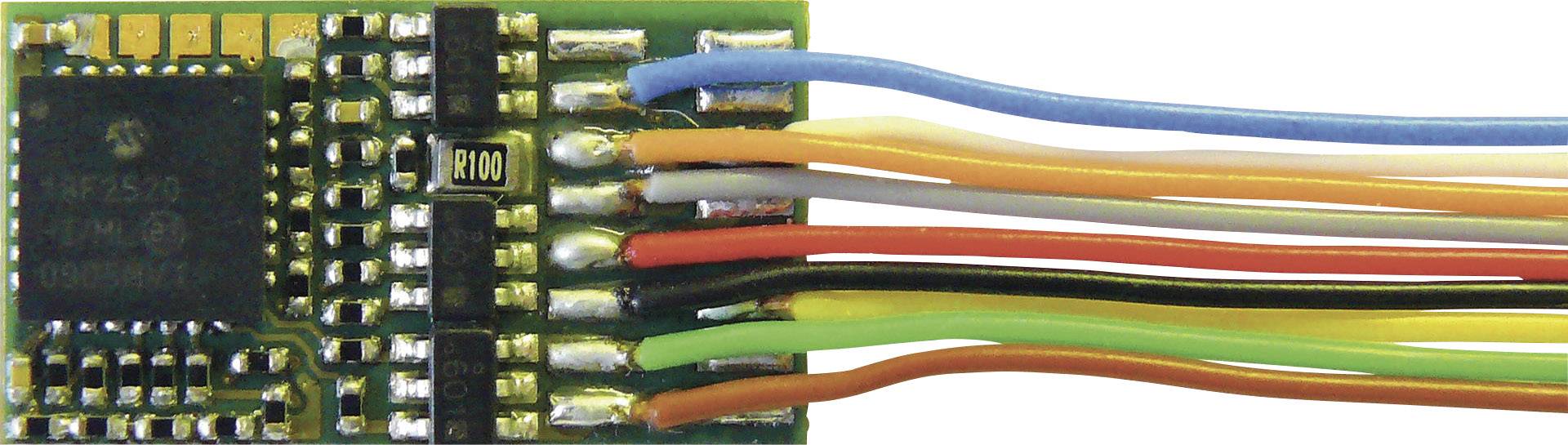 Décodeur de son avec torons et connecteur 8 pôles; peut être mis à jour; possibilité de multiprotocoles; contrôle du moteur; prise en charge de pistes de freinage; possibilité de programmer les adresses de locos; compatible NMRA; possibilité de modification aisée des paramètres d‘exploitation, dans le sens que la loco ne doit pas être ouverte; protection contre les surintensités; RailCom®