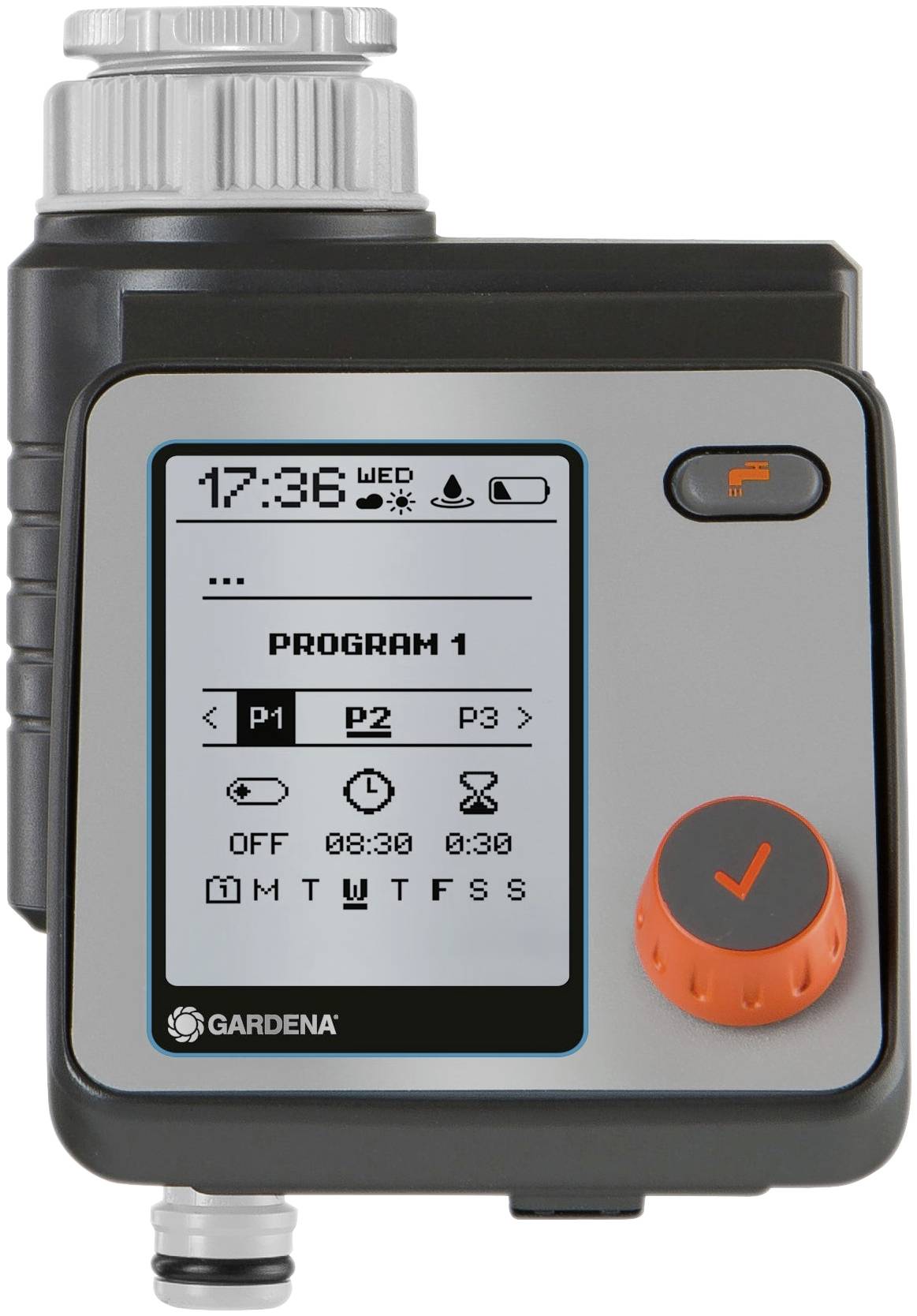 Le programmateur d'arrosage Master GARDENA permet de planifier l'arrosage de manière particulièrement flexible et individuelle. Il est possible de définir jusqu'à six plages horaires différentes et indépendantes. Le programmateur fonctionne sur piles, se branche directement sur le robinet et se commande facilement à l'aide d'un bouton rotatif et d'un bouton poussoir permettant de choisir la date et de confirmer. Un écran LCD graphique et facile à lire affiche tous les réglages en un coup d'œil. Le menu est disponible en 10 langues. L'unité de commande résistante aux intempéries est amovible. En utilisant le programmateur d'arrosage Master, vous pouvez vous adapter à la météo en réduisant la durée de l’arrosage de façon centralisée et en suspendant l'arrosage. L'appareil est idéal pour commander le distributeur d'eau automatic GARDENA. Le programmateur d'arrosage Master peut également être utilisé en combinaison avec le capteur d'humidité du sol GARDENA.