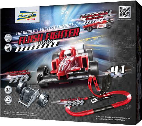 Auf dieser Bahn mit Gesamtlänge von ca. 3 Metern schießt der schneidige Formula Rennwagen durch 4 verschiedene Aufbauvarianten. In 2 Loopings darf der Präzisionsmotor seine ganze Größe ausspielen. Spannendes Gimmick: Alle 18 Bahnelemente sind auch mit anderen DARDA Bahnen kombinierbar.