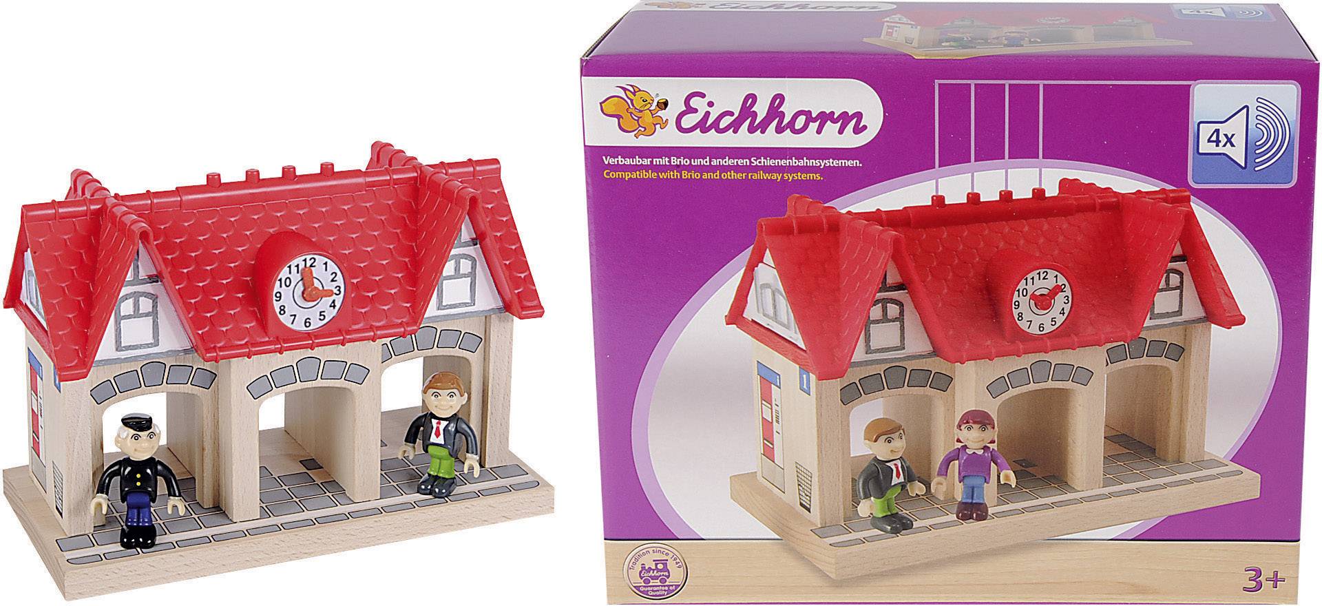 Angehende kleine Schaffner können mit dem Soundbahnhof von Eichhorn zwei Bahnhofsdurchsagen und zwei Zuggeräusche durch die Knöpfe auf dem Bahnhofsdach erzeugen. Im Set sind der Bahnhof und zwei Figuren enthalten.