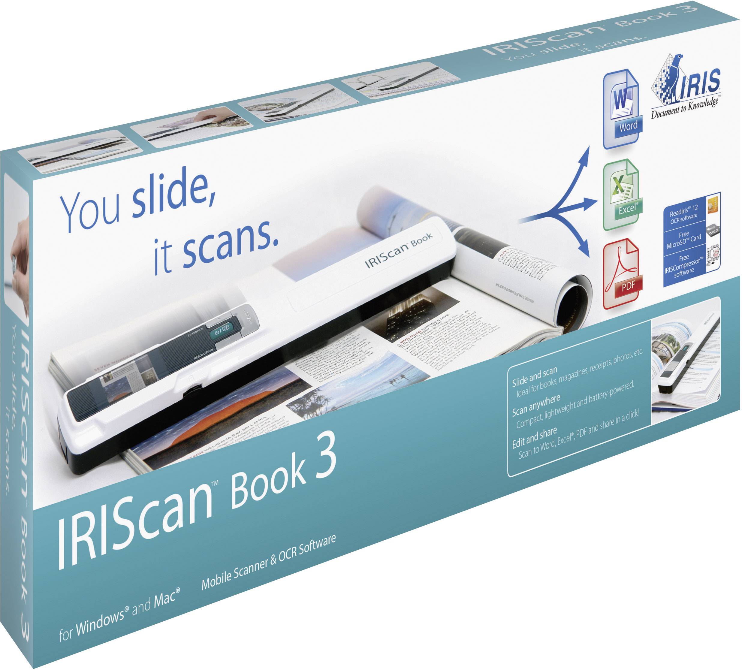 IRIScan™ Book 3 ist ein portabler Scanner, mit dem Sie jederzeit und überall Bücher und Zeitschriften scannen können, ohne dafür Seiten auszureißen. Gleiten Sie einfach über das Dokument und Ihr Scan wird automatisch auf der mitgelieferten MicroSD™-Karte gespeichert – bereit zur Weiterleitung an Ihren PC oder Mac.