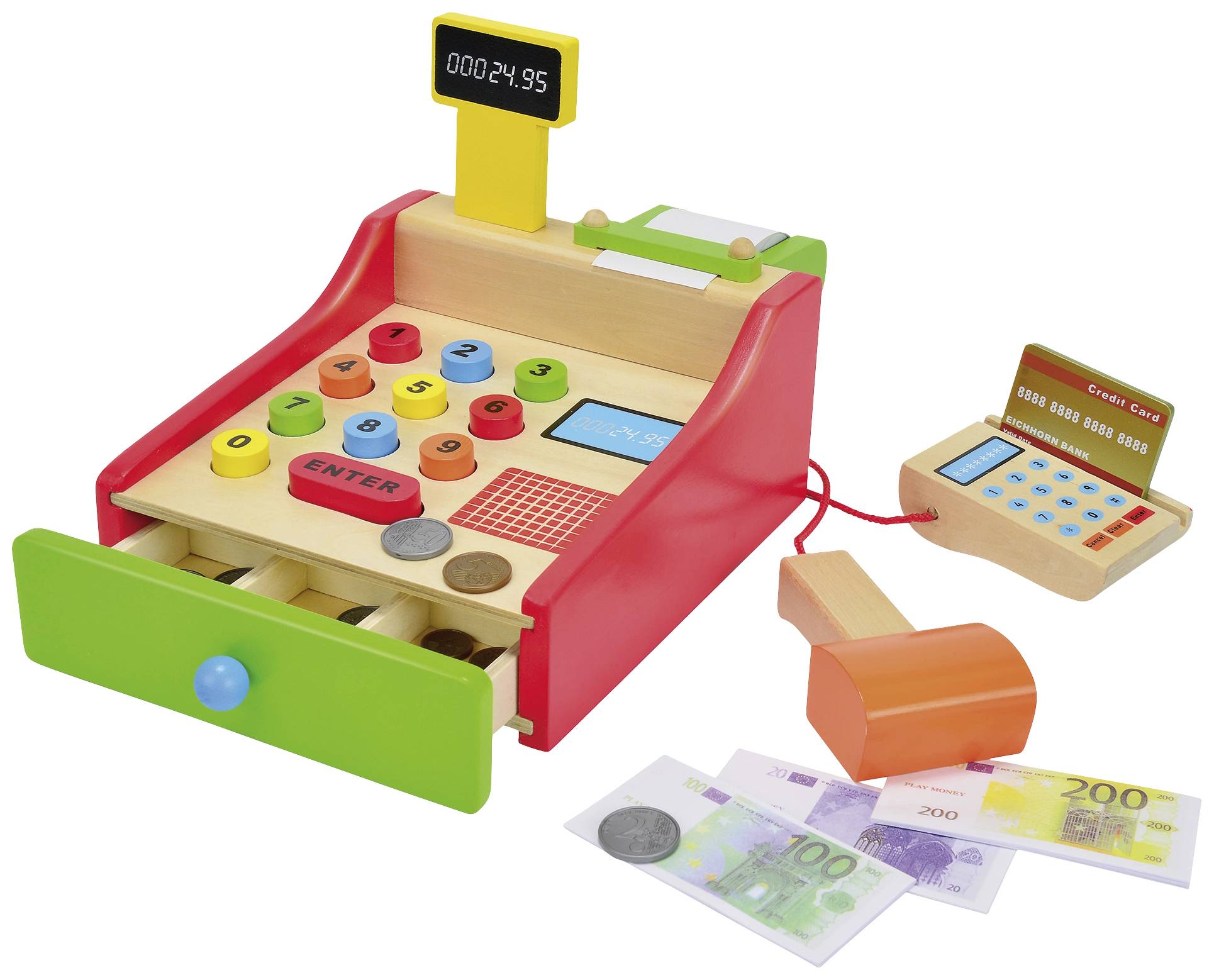 Eichhorn cash register: Eichhorn's cash register must not be missing from any retail shop. All purchased items are scanned with the scanner or calculated using the colored buttons. Payment is made with the EC card and the EC card reader. You can also find suitable change in the drawer. The set contains the cash register, a receipt paper roll, scanner, card reader incl. Card and change included. The cash register is 16.5x26x16cm in size and is suitable for children aged 3 and over.
