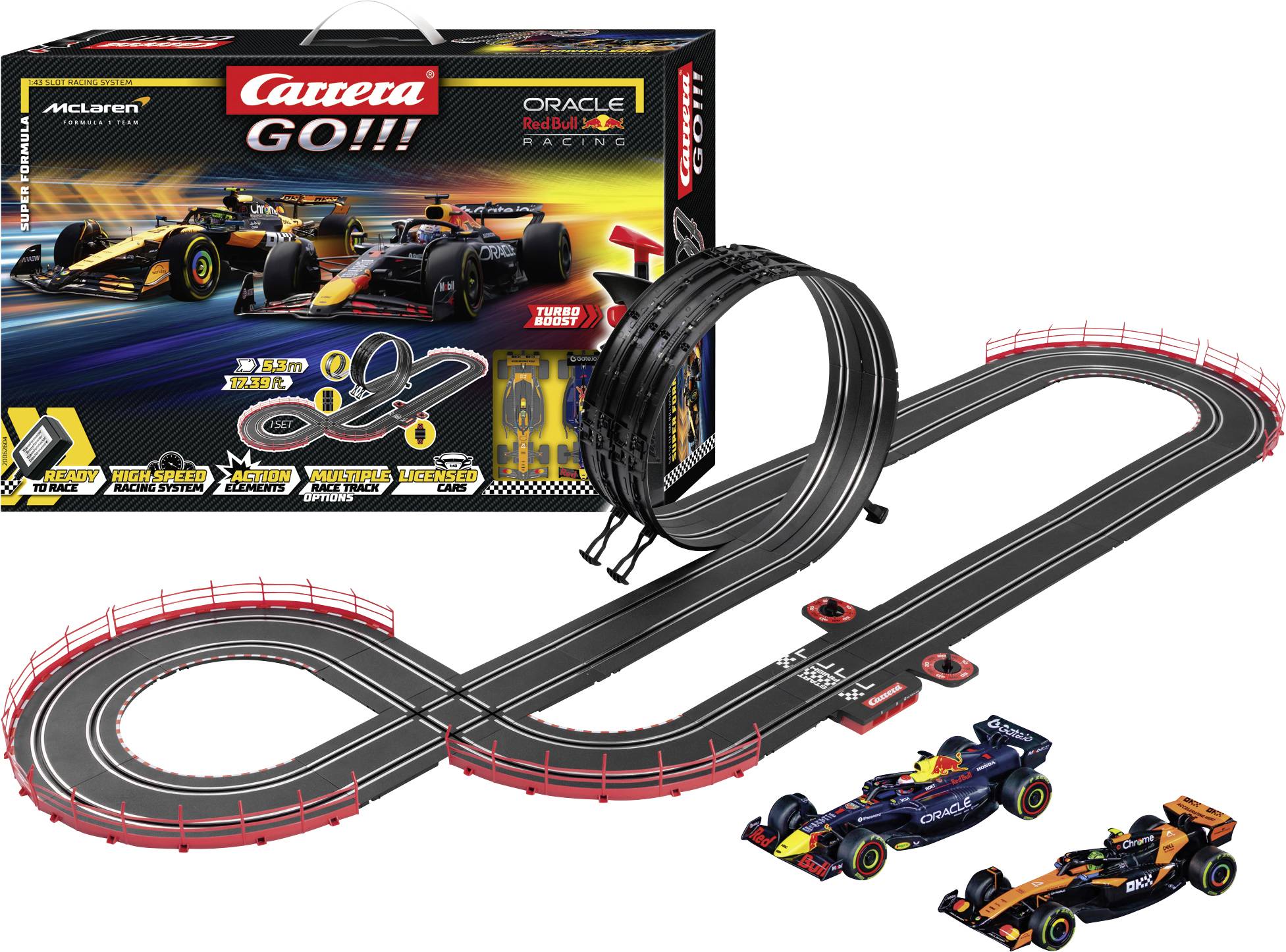 With the Carrera GO! Set "Super Formula" deliver to Max Stappen in Oracle Red Bull Racing RB21 "M. Stacked, No. 1" and Lando Norris at McLaren MCL39 "L. Norris, No. 4" packing duels. On the 5.3 meter long track with high-speed straight lines, spectacular curves and a looping, young racing drivers experience the feeling that they themselves are part of the Formula 1 world. The vehicles designed in detail provide for real racing fever, while narrow head-to-head duels and exciting overtaking maneuvers increase the adrenaline level. World-wide superiority hits the fighting spirit of an emerging talent - this set brings speed, ACTION and pure competition spirit on the track. Perfect for all, who love the thrill of Formula 1!